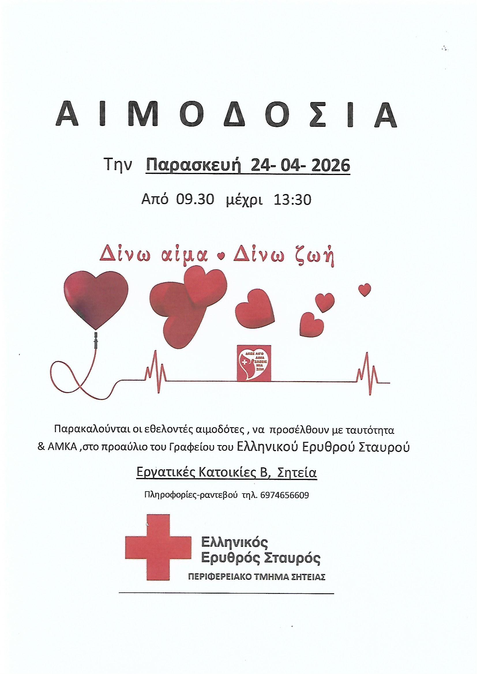 ΑρχικήΕΙΔΗΣΕΙΣΣΗΤΕΙΑΑιμοδοσία Απριλίου ΣΗΤΕΙΑ Αιμοδοσία Απριλίου By style100fm 17 Απριλίου, 2026 0 97 μερίδιο FacebookTwitter μερίδιο FacebookTwitter Προηγούμενο άρθροSantander για ΓΕΚ ΤΕΡΝΑ: Νέα τιμή-στόχος €53 – Στο επίκεντρο οι παραχωρήσειςΕπόμενο άρθροΝέα συγκέντρωση διαμαρτυρίας για την Πολεοδομία Παρασκευή 24 Απριλίου style100fm RELATED ARTICLES ΣΗΤΕΙΑ Νέα συγκέντρωση διαμαρτυρίας για την Πολεοδομία Παρασκευή 24 Απριλίου 17 Απριλίου, 2026 ΣΗΤΕΙΑ ΒΙΒΛΙΟΠΑΡΟΥΣΙΑΣΗ το Σάββατο 18 ΑΠΡΙΛΙΟΥ στις 19:30 στη Στέγη ΒΙΤΣΕΝΤΖΟΣ ΚΟΡΝΑΡΟΣ 15 Απριλίου, 2026 ΣΗΤΕΙΑ Συνάντηση Επιταφίων των Ενοριών της πόλεως Σητείας στην πλατεία Συντριβανίου τη Μεγάλη Παρασκευή το βράδυ 6 Απριλίου, 2026 Τελευταία Νέα Νέα συγκέντρωση διαμαρτυρίας για την Πολεοδομία Παρασκευή 24 Απριλίου 17 Απριλίου, 2026 Santander για ΓΕΚ ΤΕΡΝΑ: Νέα τιμή-στόχος €53 – Στο επίκεντρο οι παραχωρήσεις 16 Απριλίου, 2026 ΒΙΒΛΙΟΠΑΡΟΥΣΙΑΣΗ το Σάββατο 18 ΑΠΡΙΛΙΟΥ στις 19:30 στη Στέγη ΒΙΤΣΕΝΤΖΟΣ ΚΟΡΝΑΡΟΣ 15 Απριλίου, 2026 Αφρικανική σκόνη «πνίγει» από σήμερα τη χώρα – Έρχονται λασποβροχές και στην Κρήτη 14 Απριλίου, 2026 Φόρτωση περισσοτέρων