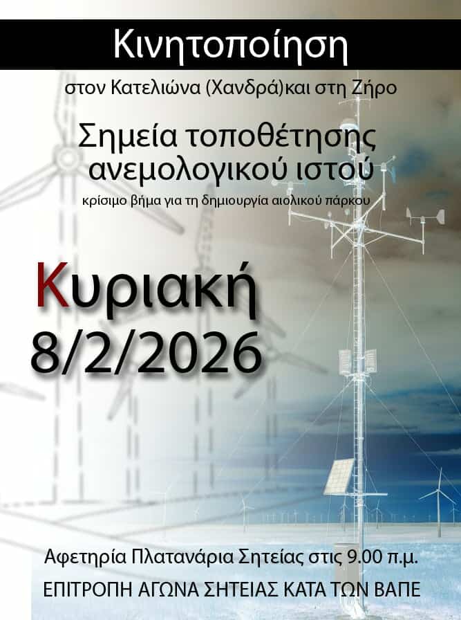 Σας Καλούμε να συμμετέχετε στην κινητοποίηση που θα γίνει την Κυριακή 8/2/2026 στις περιοχές Κατελιώνα και Ζήρου, στα σημεία που έχουν εγκατασταθεί ανεμολογικοί ιστοί και αποτελούν δυσοίωνη προαναγγελία για την δημιουργία νέων αιολικών πάρκων.