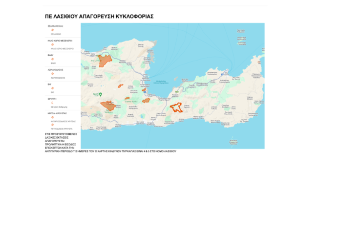 Με την υπ’αριθμ. 180436/ 27-05-2024 απόφαση του Αντιπεριφερειάρχη Λασιθίου εφαρμόζουμε το μέτρο της προληπτικής απαγόρευσης διέλευσης, παραμονής και κυκλοφορίας προσώπων και οχημάτων, σε περιοχές NATURA, καθώς και σε δασικά οικοσυστήματα, πάρκα και άλση, όπως ορίζονται στις διατάξεις του Ν.998/1979 (Α ́ 289) της Π.Ε Λασιθίου, για τις ημέρες εκείνες της αντιπυρικής περιόδου 2024 που ο «Χάρτης Πρόβλεψης Κινδύνου Πυρκαγιάς» της Γενικής Γραμματείας Πολιτικής Προστασίας είναι κατηγορίας 4 (πολύ υψηλή) ή κατηγορίας 5 (κατάσταση συναγερμού), ως κάτωθι: