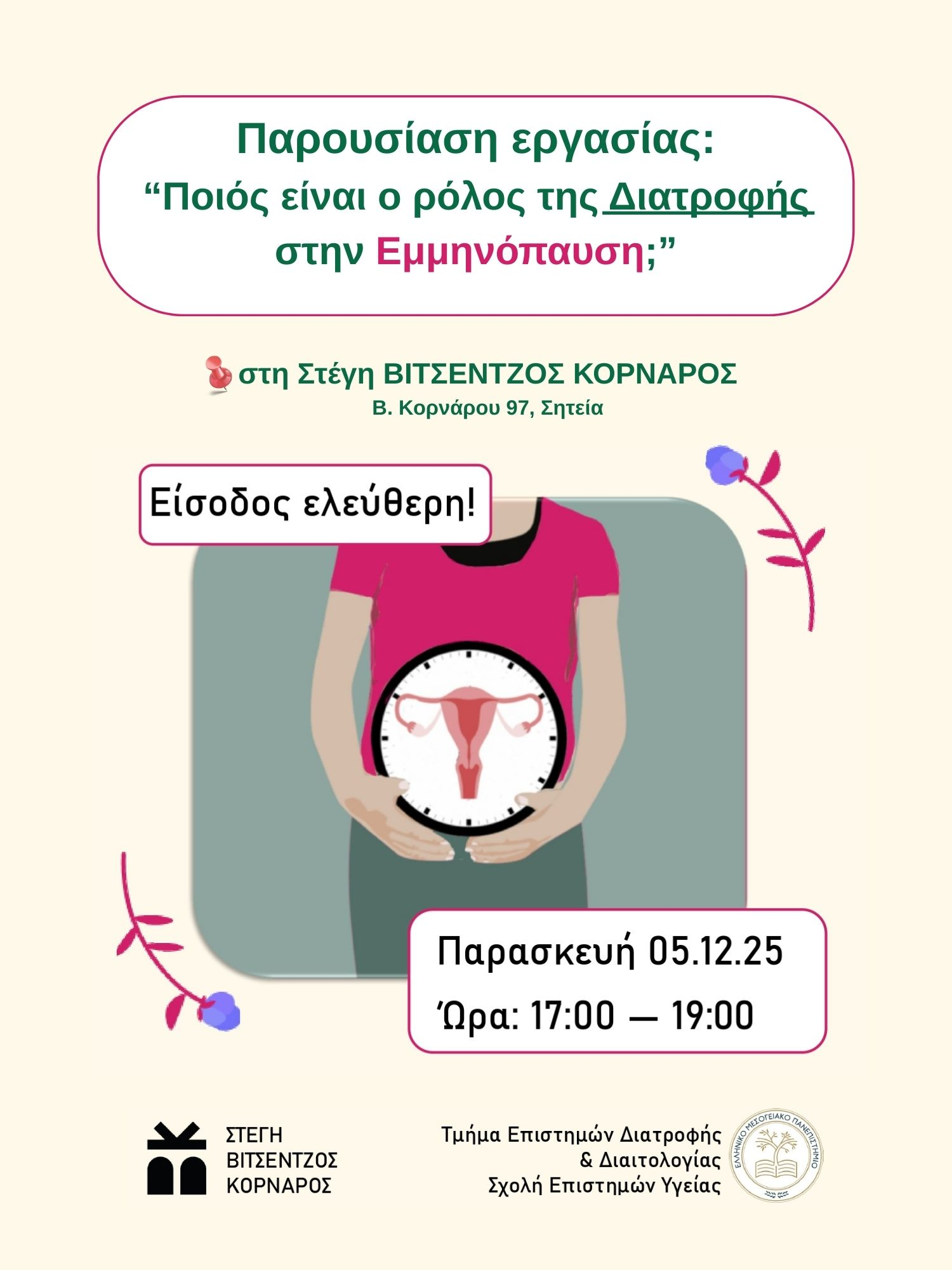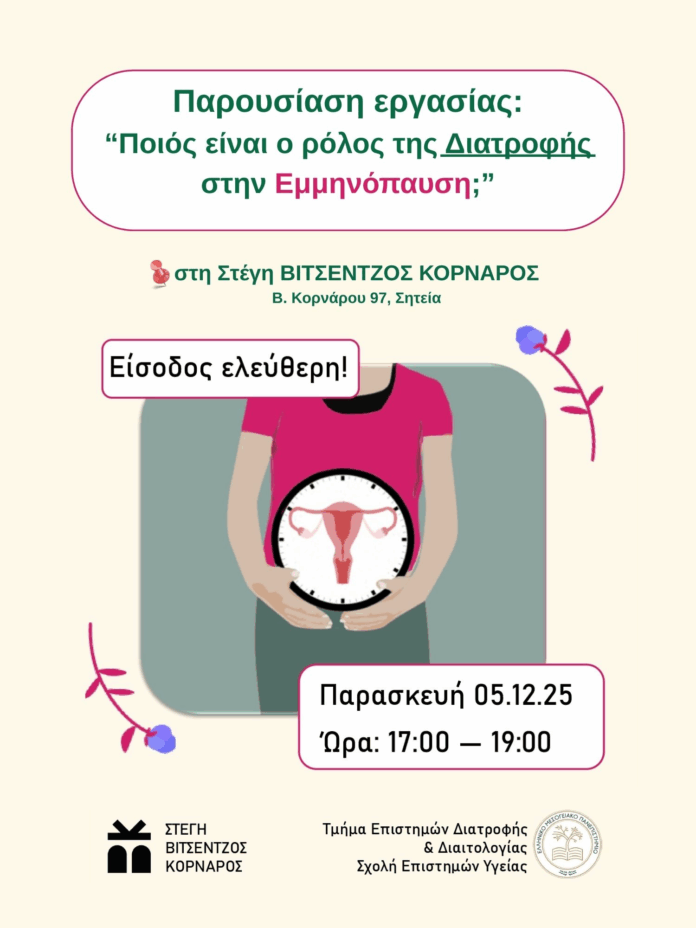 Οι τεταρτοετείς φοιτήτριες του Ελληνικού Μεσογειακού Πανεπιστημίου σε συνεργασία με τη Στέγη ΒΙΤΣΕΝΤΖΟΣ ΚΟΡΝΑΡΟΣ, σας προσκαλούν σε μία ενημερωτική εκδήλωση με θέμα: «Ποιος είναι ο ρόλος της Διατροφής στην Εμμηνόπαυση», που θα διεξαχθεί στα πλαίσια του μαθήματος Άσκηση στην κοινότητα, με επιβλέπουσα την Αναπλ. Καθηγήτρια Κοινοτικής Διατροφής Dr. Μουρατίδου Θεοδώρα.