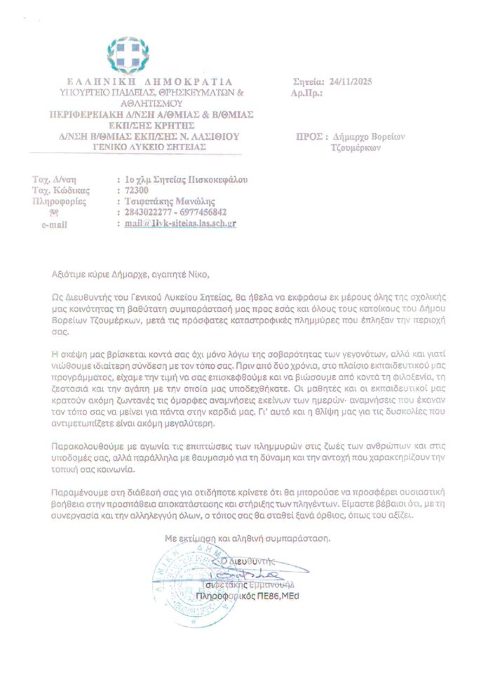 Ξεχωριστή θέση ανάμεσα στα μηνύματα που λαμβάνουμε έχει η επιστολή του Γενικού Λυκείου Σητείας.