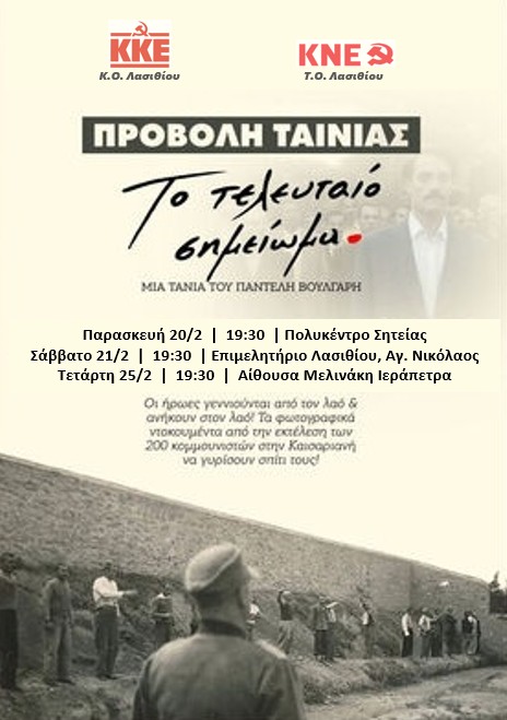 Την ταινία «Το Τελευταίο Σημείωμα» του Παντελή Βούλγαρη, θα προβάλει η Κομματική Οργάνωση Λασιθίου του ΚΚΕ και οι Οργανώσεις Βάσης Λασιθίου της ΚΝΕ, με αφορμή τα μοναδικά ντοκουμέντα που ήρθαν στο φως και «προσωποποιούν» τους 200 κομμουνιστές εκτελεσθέντες στο Σκοπευτήριο της Καισαριανής την Πρωτομαγιά του 1944, σε Αγιο Νικόλαο, Ιεράπετρα και Σητεία.