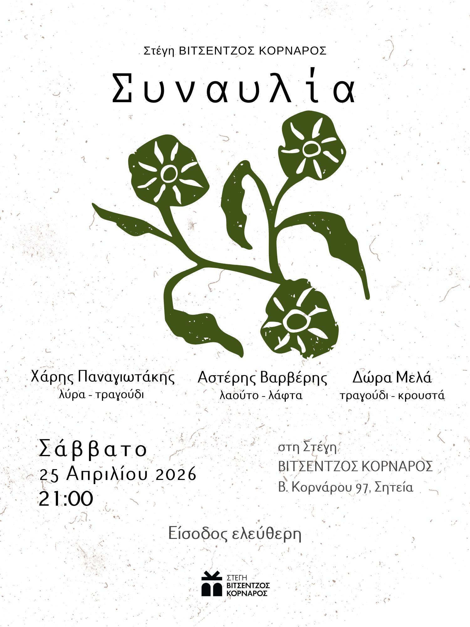 Η Στέγη ΒΙΤΣΕΝΤΖΟΣ ΚΟΡΝΑΡΟΣ σας προσκαλεί σε Συναυλία, το Σάββατο 25 Απριλίου 2026 στις 21:00,