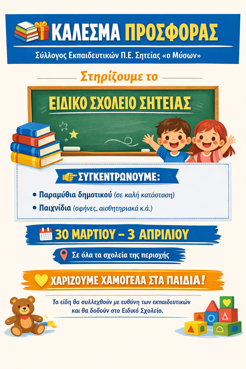 Ο Σύλλογος Εκπαιδευτικών Πρωτοβάθμιας Εκπαίδευσης Σητείας «ο Μύσων» απευθύνει κάλεσμα αγάπης και προσφοράς προς όλους τους πολίτες της Σητείας και ιδιαίτερα προς τους γονείς των μαθητών.