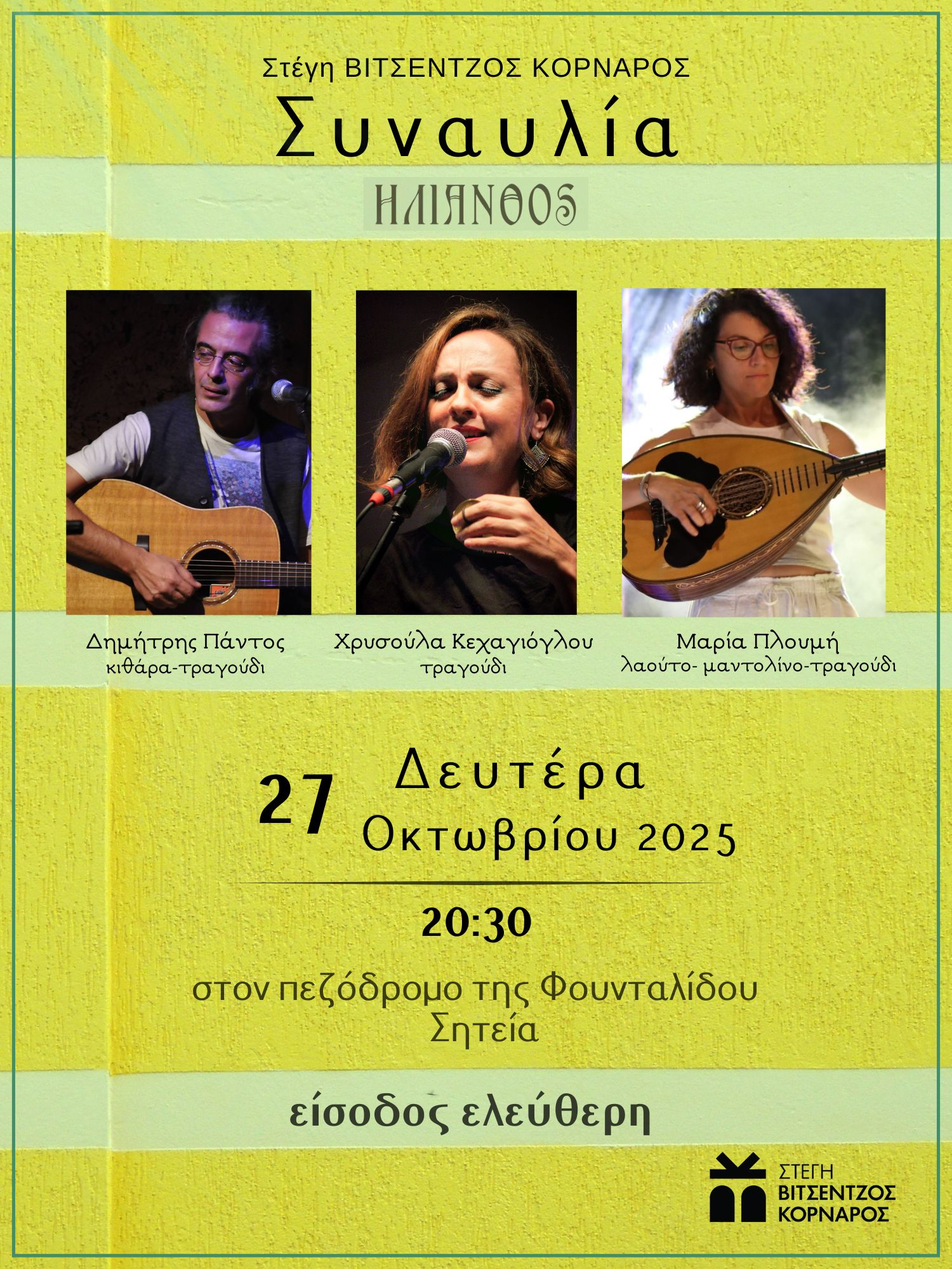 Η Στέγη ΒΙΤΣΕΝΤΖΟΣ ΚΟΡΝΑΡΟΣ σας προσκαλεί σε μια ξεχωριστή μουσική βραδιά με το μουσικό σχήμα ”Ηλίανθος” που αποτελείται από τους: