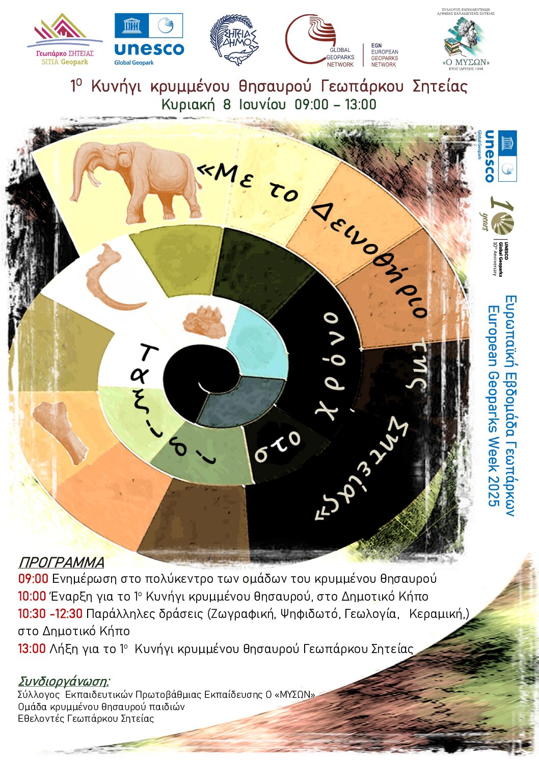 Με αφορμή την Παγκόσμια Ημέρα Περιβάλλοντος, ο Σύλλογος Εκπαιδευτικών ΠΕ Σητείας σε συνεργασία με τον συντονιστή Γεωπάρκου Σητείας , τον Δήμο Σητείας και την ομάδα κυνηγιού κρυμμένου θησαυρού για παιδιά, συνδιοργανώνουν την Κυριακή 8 Ιουνίου παιδικό κυνήγι θησαυρού με θέμα «ΤΑΞΙΔΙ ΣΤΟΝ ΧΡΟΝΟ ΜΕ ΤΟ ΔΕΙΝΟΘΗΡΙΟ ΤΗΣ ΣΗΤΕΙΑΣ» και 5 παράλληλες δραστηριότητες! Η εκδήλωση στοχεύει στην ενίσχυση της ευαισθητοποίησης, της ενημέρωσης και της γνωριμίας των μαθητών μας με το Γεωπάρκο και τον φυσικό πλούτο του τόπου μας.