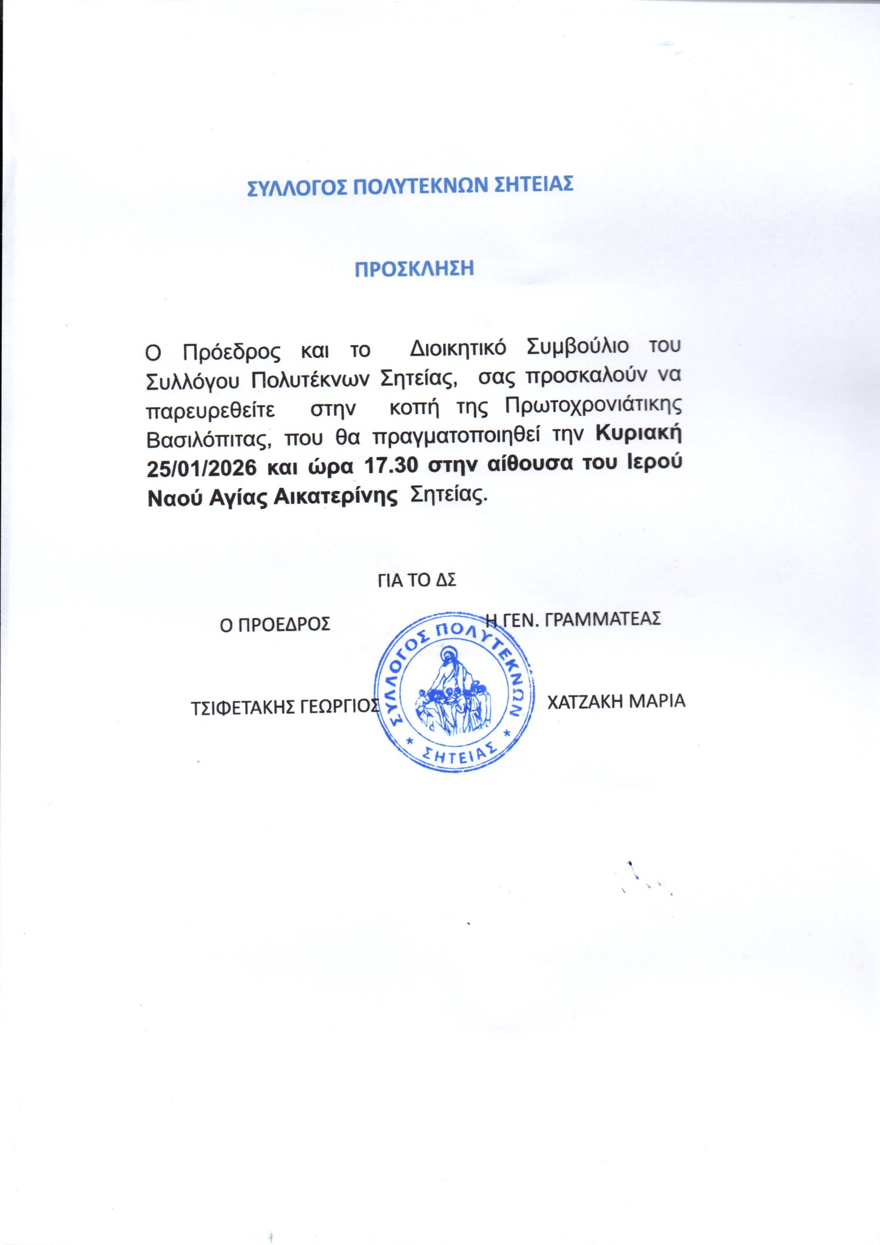 ΑρχικήΕΙΔΗΣΕΙΣΣΗΤΕΙΑΣύλλογος Πολυτέκνων Σητείας : Πρόσκληση σε κοπή Βασιλόπιτας ΣΗΤΕΙΑ Σύλλογος Πολυτέκνων Σητείας : Πρόσκληση σε κοπή Βασιλόπιτας By style100fm 23 Ιανουαρίου, 2026 0 168 μερίδιο FacebookTwitter μερίδιο FacebookTwitter Προηγούμενο άρθροΓ. Πλακιωτάκης: Η Ευρώπη χρειάζεται εγρήγορση και συνοχήΕπόμενο άρθροΟ πρόεδρος του πανελλήνιου συνδέσμου εξαγωγέων Άλκης Καλαμπόκης μίλησε στην πρωινή ζώνη του Style 100 για την πορεία των ελληνικών εξαγωγών μετά και τους δασμούς που επέβαλε η κυβέρνηση Τραμπ και τις προκλήσεις για το νέο έτος style100fm RELATED ARTICLES ΣΗΤΕΙΑ Τετάρτη 4 Φεβρουαρίου πανηγυρίζει ο φερώνυμος Ιερός Ναός της Ιεράς Σταυροπηγιακής Μονής Τοπλού στο ακρωτήρι «Κάβο Σίδερο» 30 Ιανουαρίου, 2026 ΣΗΤΕΙΑ «Η Κυβέρνηση με την κατάργηση των σχολικών επιτροπών συνεχίζει την οικονομική ασφυξία & υπολειτουργία των σχολικών μονάδων» 29 Ιανουαρίου, 2026 ΣΗΤΕΙΑ Kοπή της Πρωτοχρονιάτικης Βασιλόπιτας του ΝΟΣ 27 Ιανουαρίου, 2026 Τελευταία Νέα Τετάρτη 4 Φεβρουαρίου πανηγυρίζει ο φερώνυμος Ιερός Ναός της Ιεράς Σταυροπηγιακής Μονής Τοπλού στο ακρωτήρι «Κάβο Σίδερο» 30 Ιανουαρίου, 2026 ΔΙΑΚΡΙΣΗ ΠΑΙΔΙΩΝ ΤΟΥ ΔΗΜΟΥ ΜΑΣ 30 Ιανουαρίου, 2026 ΣΥΓΧΑΡΗΤΗΡΙΟ ΜΗΝΥΜΑ 30 Ιανουαρίου, 2026 «Η Κυβέρνηση με την κατάργηση των σχολικών επιτροπών συνεχίζει την οικονομική ασφυξία & υπολειτουργία των σχολικών μονάδων» 29 Ιανουαρίου, 2026 Φόρτωση περισσοτέρων