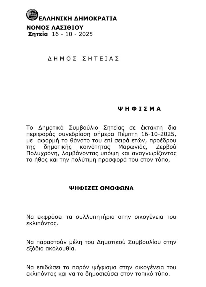 Το Δημοτικό Συμβούλιο Σητείας σε έκτακτη δια περιφοράς συνεδρίαση σήμερα Τετάρτη 16-10-2025, με αφορμή το θάνατο του επί σειρά ετών, προέδρου της δημοτικής κοινότητας Μαρωνιάς, Ζερβού Πολυχρόνη, λαμβάνοντας υπόψη και αναγνωρίζοντας το ήθος και την πολύτιμη προσφορά του στον τόπο,